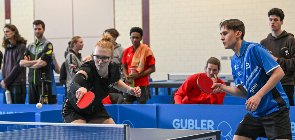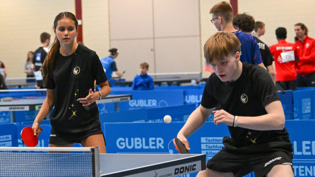 Am Nachmittag lautete die Devise an die sehr erfolgreichen Einzelresultate nun anzuknüpfen. Im U19 Mixed Doppel schienen Sevi und Jill dies sich ans Herz genommen zu haben und qualifizierten sich fürs Halbfinal gegen Doutaz/Desroches (ZZ-Lancy), eine auf dem Papier unlösbare Aufgabe angesichts der Form der amtierenden Elite-Schweizermeisterin. Doch Coach Markus Baumann hatte noch einige Schachzüge auf Lager, die er grossartig auszuspielen wusste. Sevi und Jill starten wie die Feuerwehr und sichern sich trotz Mega-Comeback der Gegner den ersten Durchgang. Das gesammelte Momentum zum Satzende nutzen die Genfer anschliessend zum direkten Ausgleich, alles wieder offen! Diesen Rückschlag steckte Team YSZ aber ausgezeichnet weg. In einem stetigen Hin und Her erkämpften sie sich mit 12-10 die erneute Führung, ehe sie ihren Gegnern im vierten Satz beim Stand von 9-5 scheinbar enteilten. Doch mit dem Endspiel vor den Augen schlichen sich nun die ersten Nerven ins Spiel und ehe man sich versah waren Doutaz und Desroches nur ein gewonnener Ballwechsel vom fünften Durchgang entfernt. Mit unglaublichen Topspins aus zwei Metern hinter der Platte schafften es Jill und Severin aber schliesslich mit 15-13 den Kopf aus der Schlinge zu ziehen und den mythisch-legendären Finaleinzug zu bejubeln.