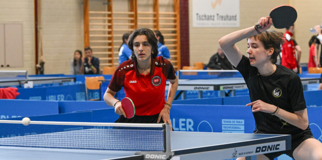 Das zweite Wunder von Lyss war also offiziell Tatsache und Nummer drei liess nicht lange auf sich warten. Im U17 Mixed Doppel geriet Lenni mit Ella Delvecchio (ZZ-Lancy) im Startspiel mit 0-2 in Rücklage und waren anschliessend zwei Punkte vom frühen Aus entfernt. Dank den Tipps von Alec Tarashev konnte das Zürich/Genf-Duo das Blatt wenden und ein Halbfinal gegen Seraina und ihren Partner Ben Meier (Rapid Luzern) sichern. Die Favoritenrolle lag ganz klar bei den besser eingespielten Titelverteidigern, doch an diesem sonnigen Nachmittag regnete es regelrecht Sensationen. Nach einer unglaublichen Performance gewannen Lenni und Ella mit 3-1 und beendeten die Regenschaft von Seraina und Ben, die 2022 in dieser Halle auch schon bei den U15 triumphiert hatten! Nun fehlte nur noch ein Sieg von Noe, der neben Maéva Giezendanner (ebenfalls ZZ-Lancy) antrat, und wir bekämen das zweite Keusch-interne Final des Tages zu sehen. Dieser Traum geriet jedoch schnell in weite Ferne, als die Paarung Kloss/Patra (Neuhausen) eine 2:0-Satzführung erspielen konnte. Aber wie wir wissen, hat sich YSZ in Lyss einen Ruf für Überraschungen und Aufholjagden etabliert. Die Anweisungen von Lancy-Coach Michel Martinez (Frankreich’s frühere Nummer zwei), beim originalen Wunder von Lyss (als Noe trotz 0:2-Satzrückstand und drei Matchbällen U15-Schweizermeister wurde) noch der gegnerische Trainer, verhalfen Noe und Maéva einen Weg zurück ins Spiel zu finden und anschliessend auch einen Entscheidungssatz zu erzwingen! Und in diesem lief YSZ’s Nummer eins, von seiner Partnerin optimal lanciert, zur absoluten Hochform auf und knallte den Neuhausern eine Vorhand nach der anderen um die Ohren…das YSZZ-Final war Tatsache!!