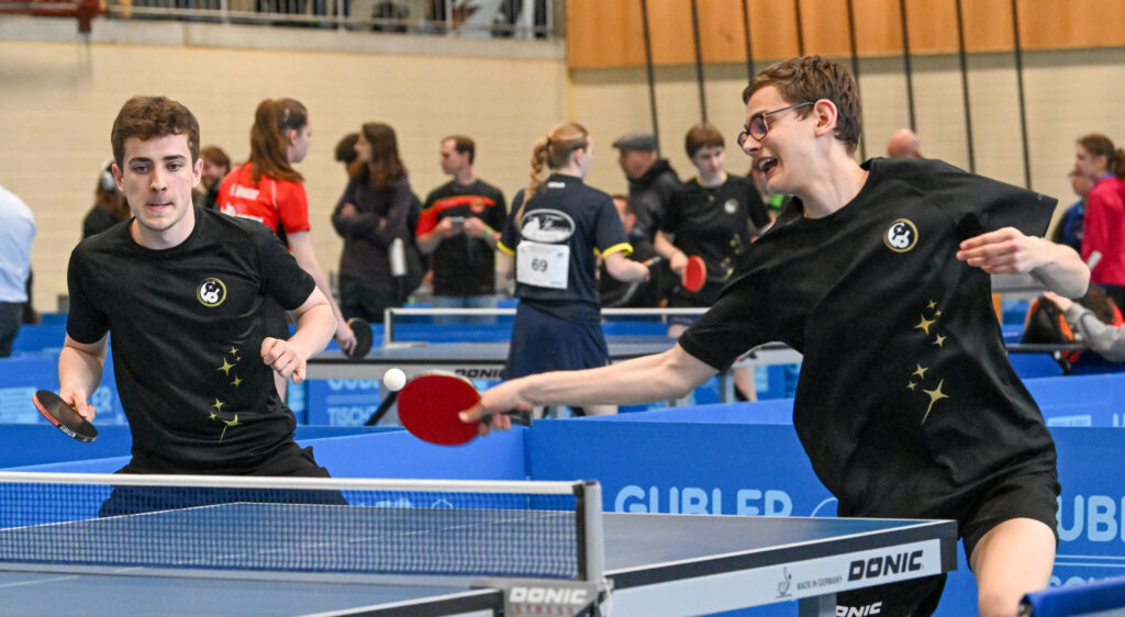 Die letzte Chance auf den fünften Titel des Tages sollte es also im U17 Knaben Doppel geben, wo Noe und Lenni – nachdem sie sich bereits zweimal in einem Finale gegenüber gestanden waren – sich nun verbündeten und gemeinsam ihren zweiten Turniersieg des Tages anpeilten. Den beiden Brüdern, die als haushohe Favoriten ins Rennen stiegen, wurde sehr harte Gegenwehr geboten, besonders im Halbfinal, als die Paarung Andric/Omlin (Basel/Muttenz) nach mirakulöser Aufholjagd auf einmal im vierten Durchgang 10-5 führten und nur einen Punkt vom Entscheidungssatz standen. Dank unglaublichen Gegentopspins konnten die Keuschs das Ruder aber gerade noch rechtzeitig rumreissen und qualifizierten sich fürs Finale. Auch die an zweiter Stelle gesetzten Abalakov und Meier schlugen sich hier wacker und entschieden den zweiten Satz verdientermassen für sich. Doch der 20. April war definitiv der Tag des N.L. Keusch und daran änderte sich auch im letzten Match des Tages nichts. Mit 11-8 und 11-7 gewannen Noe und Lenni die Sätze drei und vier und bejubelten ihren zweiten Titel des Tages, wie auch ihren zweiten gemeinsamen Schweizermeistertitel (nach der Mannschafts-SM 2019)!