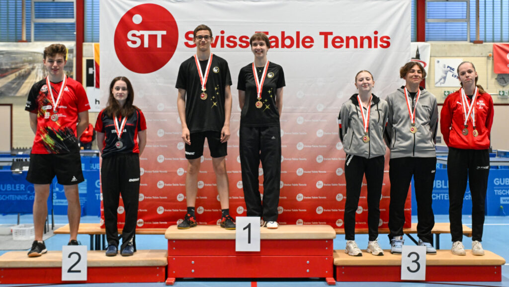 Nach einer erholsamen Mittagspause sollte es mit den Mixed-Kategorien weitergehen, wo Ethan bei den U11 an der Seite von Yuling Li (Uster) durchaus was zuzutrauen war. Und tatsächlich: das von Chefcoach Dominik Mätzener grossartig motivierte Duo sicherte sich nach einem hart erarbeiteten 3:1 im Viertelfinal den Podestplatz. Trotz der anschliessenden klaren Niederlage gegen die Favoriten aus Muttenz und Lancy konnten sich die zwei am Abend bei der Siegerehrung freudestrahlend die Bronzemedaille umhängen lassen.