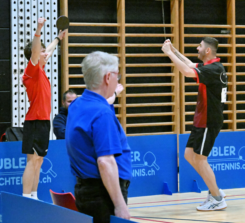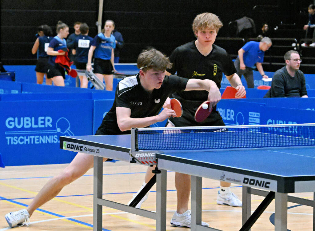 Leider reflektierte das Abschneiden von Lars und Filip zu einem Grossteil diese Kategorie für unseren Verein. So musste sich Noah mit Pino Keller (Wetzikon) im Startspiel bitter mit 1-3 geschlagen geben, während Gian und Severin gegen die viel höher klassierten Vorherr/Bernhard ein unglaubliches Spiel machten, am Ende aber ebenfalls mit 9-11 im Entscheidungssatz den Kürzeren zogen. Angesichts der späteren Resultate ihrer Gegner sollten sie mit dem Gezeigten aber dennoch gut leben können…