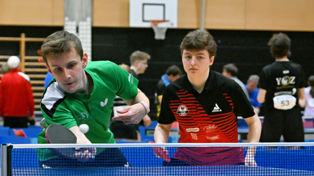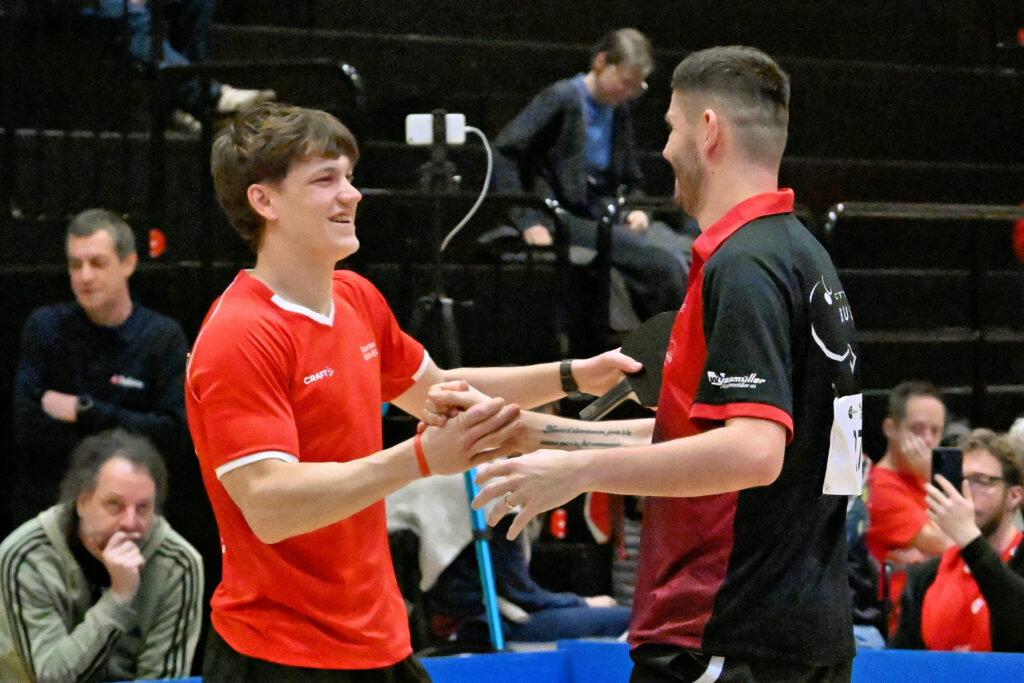 Bei den Herren trafen Gian und Samir in der Startrunde auf die Nationalspieler Elias Hardmeier (Effeltrich / D) und Cédric Tschanz (Rio-Star Muttenz), denen sie chancenlos unterlagen. Noah begann sein Match gegen Nicolas Simonet (Vevey) explosiv, als er den ersten Satz aber trotz 9:2-Führung aus der Hand gab, war der Traum einer Sensation erloschen. Somit ging es nebst unseren vier STTL-Spielern, aka die “Funtastic four”, lediglich für Sevi weiter, nachdem der Aargauer seinen Dauerrivalen Fedor Abalakov (Rapperswil-Jona) mit 4-1 bezwang. Leider hielt auch hier die Erfolgssträhne nicht lange…