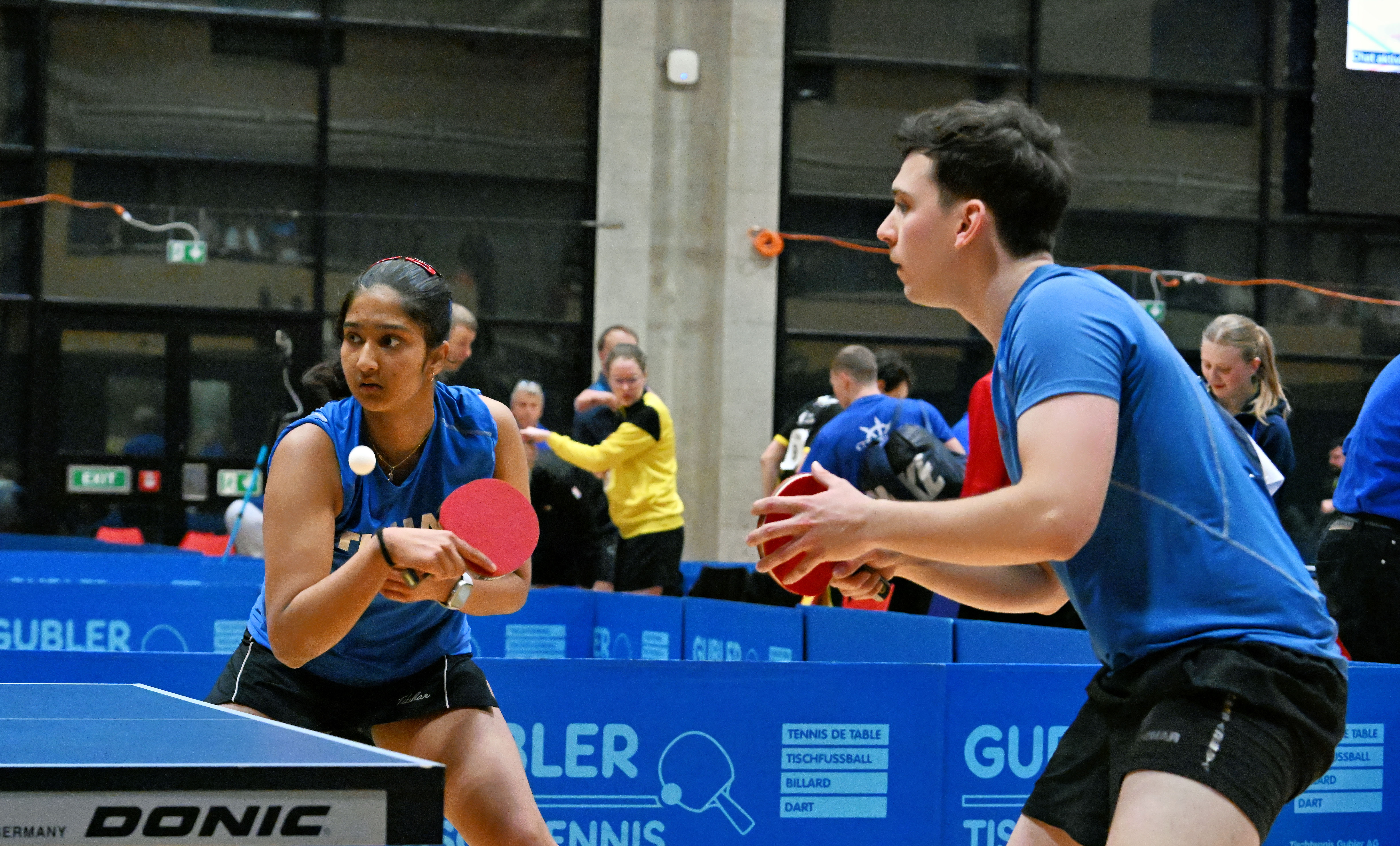 Wie üblich startete der Samstag mit dem Mixed Doppel. Barish musste an der Seite von Nina Tullii (La Chaux-de-Fonds) einen phänomenalen Start von ex-YSZ’ler Severin Scherer (Rio-Star Muttenz) und dessen Partnerin Emily Wu (Uster) hinnehmen, ehe die Neuenburger den Spiess drehten und gegen Champod/Maurer (Bernex) die Chance aufs Podest hatten. In einem packenden Match mit vielen spektakulären Ballwechseln gelang es Barish und Nina dann auch dank einem Schlussfurioso im Entscheidungssatz den Sieg an sich zu reissen und ihre zweite gemeinsame Medaille zu sichern. Zeitgleich war auf dem Nebentisch sein Mannschaftskapitän Filip mit Akhyata Patra (Neuhausen) gegen die haushohen Favoriten, Doutaz/Rebetez (ZZ-Lancy), nahe am Exploit. Die amtierenden Ostschweizer Meister kämpften sich auf heroische und dramatische Weise zurück in die Partie, unterlagen letztendlich aber leider nach zwischenzeitlicher Führung im Entscheidungssatz mit 11-13!